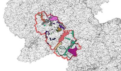 und über "Vektor/Geoverarbeitungswerkzeuge/Clip" auf die Landkreise "Birkenfeld, Bernkastel-Wittlich" zugeschnitten. Zudem habe ich über "Vektor/Geoverarbeitungswerkzeuge/Puffer", einen 200m Puffer um die Naturschutzgebiete eingegeben und die Naturschutzgebiete durch Doppelklick auf den Layer "FFH_BIR_WIL_intersect", "Darstellung","Eindeutiger Wert","Klassifizieren" in unterschiedliche Farben unterteilt.