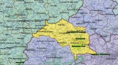 Nachdem man das Projekt mit den spezifischen Projekteigenschaften (Pfade speichern: relativ, Einheiten: Meter...) eingestellt hatte, fügte man den Rasterlayer TK 100 und den Vektorlayer Landkreise dazu. Beim Layer Landkreise bearbeitete man unter Eigenschaften die Farbgebung so, dass nur noch die Landkreisgrenzen rot umrandet zu sehen sind. Dasselbe machte man mit den Verbandsgemeinden und Gemeinden. Schließlich fügte man noch die Naturschutzgebiete hinzu. Bei den Landkreisen stellte man noch einen Layer ein und ging unter Eigenschaften auf Legendentyp und dort auf "eindeutiger Wert", wodurch jeder Landkreis eine eigene Farbe erhielt. Am Ende stellt man noch bei den Layern Naturschutzgebieten und Gemeinden unter Eigenschaften, Beschriftung, die Schrift "ein" und bearbeitet die Maßstäblichkeit dieser, damit die Schrift nicht so groß erscheint.